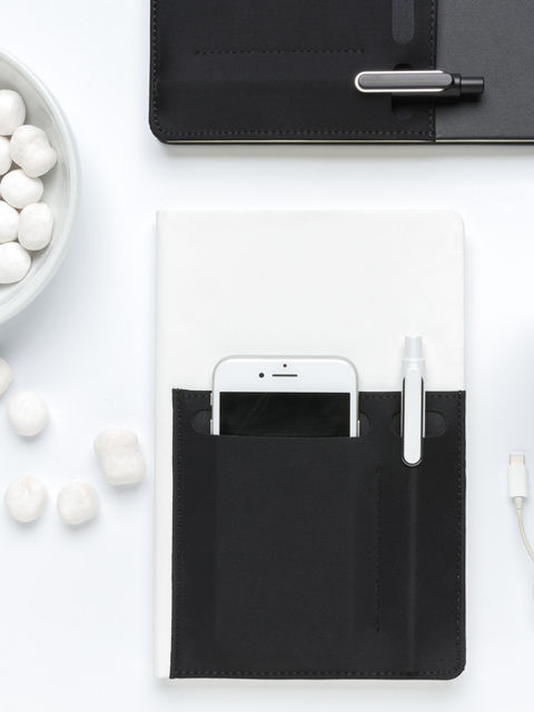 A5-ös méretű jegyzettömb 160 krémszínű, vonalas oldallal (80g/m2). A fedőlapon egy rugalmas telefon-és tolltartó zseb és egy dokumentumoknak szánt nagyobb tok található. A telefontartó zseb 8cm-es. Szélessége megfelel az iPhone 7 plus telefonénak.