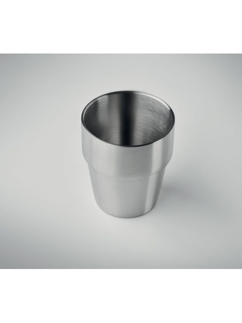 Duplafalú pohár újrahasznosított rozsdamentes acélból (90% újrahasznosított rozsdamentes acél és 10% rozsdamentes acél). Rakásolható. Űrtartalom: 250 ml.