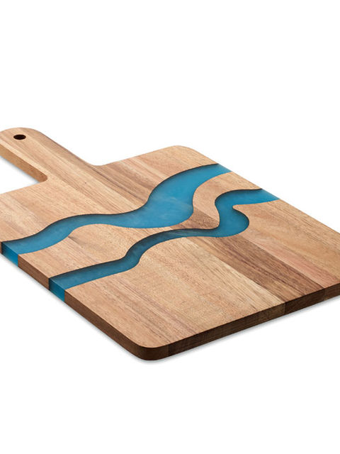 Akáciafa tálalódeszka fogantyúval, dekoratív epoxigyanta részletekkel. A fa természetes anyag, termékenként szín- és méretbeli eltérések jelentkezhetnek, ami befolyásolhatja a dekoráció végső eredményét.