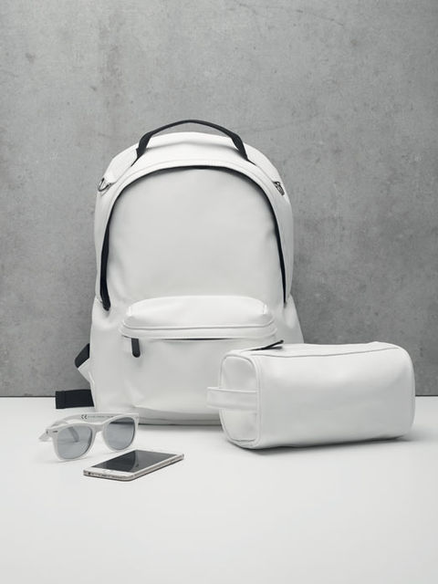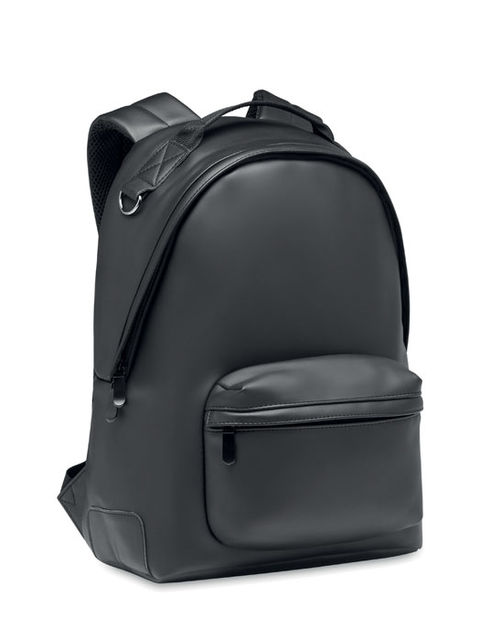 15 colos laptop hátizsák puha PU anyagból, párnázott háttal és megerősített aljjal. Elülső cipzáras zseb. Bélése 210D RPET.