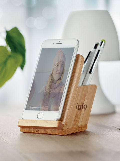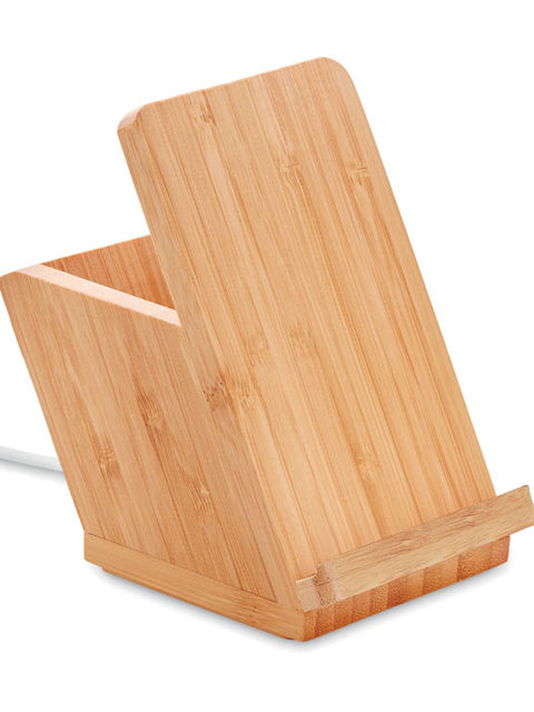 Kéttekercses vezeték nélküli töltő bambuszból, egy telefon töltéséhez, állvány és tolltartó funkcióval. DC5V/1A (5W) teljesítmény. A bambusz természetes anyag, termékenként szín- és méretbeli eltérések jelentkezhetnek, ami befolyá