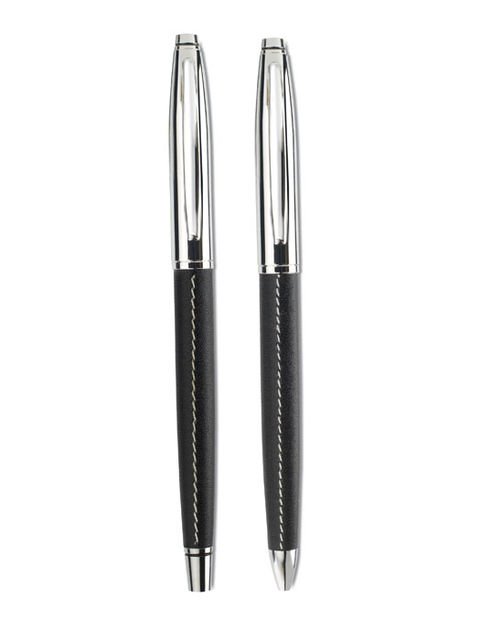 Golyóstoll és roller toll szett cipzáras PU bőr tokban, kontrasztos varrással. A golyóstoll kék, a roller feketén író betéttel.
