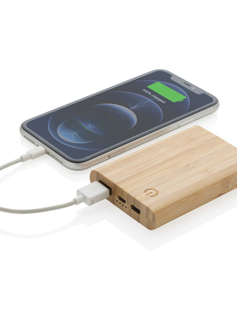 5000 mAh powerbank 100% FSC-tanúsítvánnyal rendelkező bambusz borítással. Időtálló, A fokozatú 5000 mAh lítium-polimer akkumulátorral rendelkezik. Töltöttségjelzővel. Bemenete micro és C típusú csatlakozó DC5V/2A; kimenete USB A, DC5V/2A; PVC-mentes újrahasznosított TPE töltőkábellel. A termék és tartozékai egyaránt 100% PVC-mentesek. FSC mix csomagolásban.