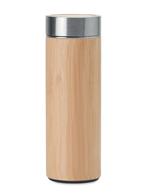 Duplafalú rozsdamentes acél termosz bambusz borítással, teaszűrővel. 400 ml űrtartalom. A bambusz természetes anyag, színében, mintázatában és méretében esetenként eltérő lehet. FSC®-certified | FSC 100%, N5.7, FSC-C213206