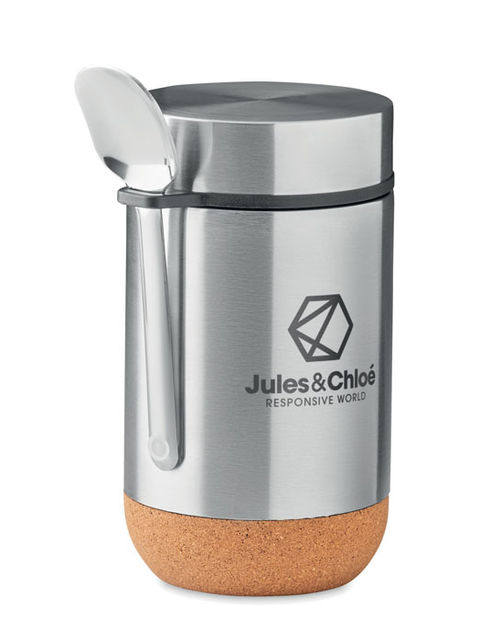 Duplafalú, rozsdamentes acélból készült, termoszedény csavaros kupakkal és parafa aljjal. Kanállal együtt. Űrtartalom: 400 ml.A parafa 100%-ban természetes anyag. Szerkezeti jellege és felületi porozitása miatt az egyes tárgyak végső emblémázási eredménye eltéréseket mutathat.