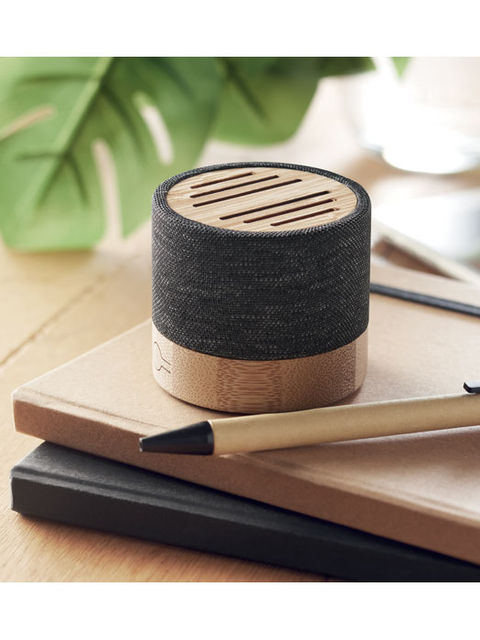 5.0 vezeték nélküli hangszóró RPET házban, bambusz részlettel a tetején, LED-es fényjelzéssel. 1 db újratölthető 300 mAh lítium-ionos elemmel. SD-kártya portot és AUX/USB kábelt tartalmaz. Teljesítmény: 3W, 3 Ohm és 5V. Üzemidő kb. 3 óra. A bambusz természetes anyag, színében, mintázatában és méretében esetenként eltérő lehet.
