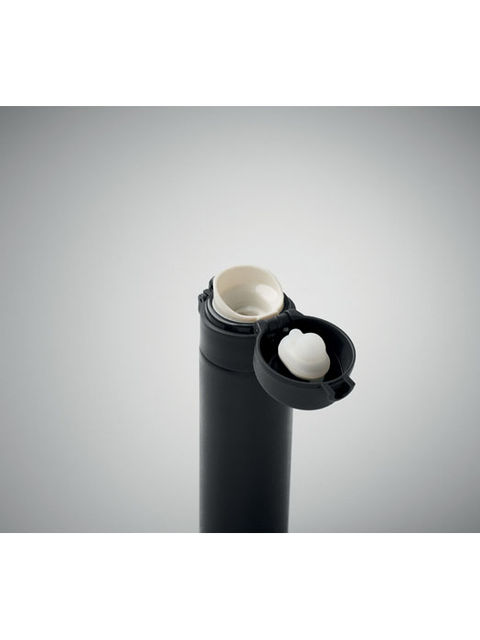 Duplafalú palack újrahasznosított rozsdamentes acélból (90% újrahasznosított rozsdamentes acél és 10% rozsdamentes acél), biztonsági zárral a fedélen és nyomógombos nyitási opcióval. Szivárgásmentes. Űrtartalom: 300 ml.