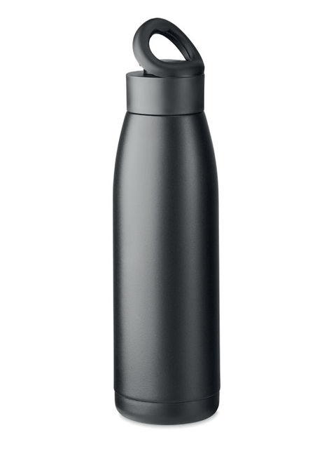 Duplafalú, újrahasznosított rozsdamentes acél palack (90% újrahasznosított- és 10% rozsdamentes acél), puha szilikon hordozógyűrűs fedéllel. A palack felületének hőmérséklete a benne lévő folyadék hőmérsékletétől függően változik, ha megrázzuk. Szivárgásmentes. 400 ml.