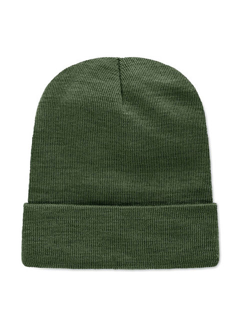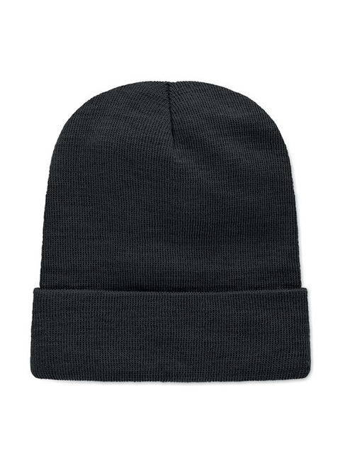 Uniszex kötött sapka, puha rugalmas RPET poliészterből, mandzsettával és felvarróval.