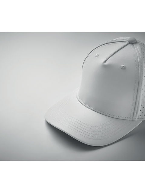 5 paneles, poliészter sportsapka állítható tépőzáras záródással, lézervágott lyukakkal, 2 színazonos, hímzett szellőzőlyukkal. Gyorsan száradó, izzadság- és vízlepergető. 130 g/m².