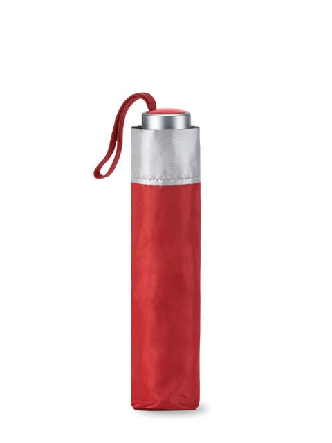21 colos, manuális, 3 szakaszos összecsukható esernyő 190T poliészter anyagból. Galvanizált fém nyél és csúcsok. Fekete bevonatú fém váz. Színes műanyag panelek belül ezüst betéttel. Színes műanyag markolat ezüst díszítéssel és fekete csuklópánttal. Hozzáillő tokban, ezüst díszítéssel.
