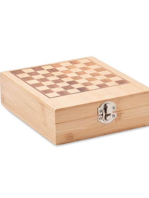 Sakktábla boros készlet bambusz dobozban. Dugóhúzót, kiöntőt, palack visszazárót és cseppfogó gyűrűt tartalmaz.