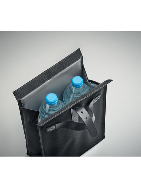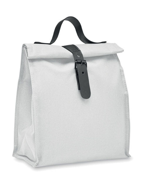 600D RPET poliészter, rolltop csavart záródású uzsonnás hűtőtáska PU fogantyúval és csatos pánttal. Szigetelés: 3 mm-es PE hab PEVA-val.