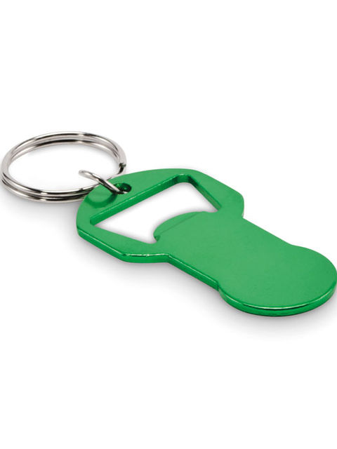 Újrahasznosított alumínium kulcstartó bevásárlókocsi-érmével, üvegnyitóval, vas kulcskarikával.