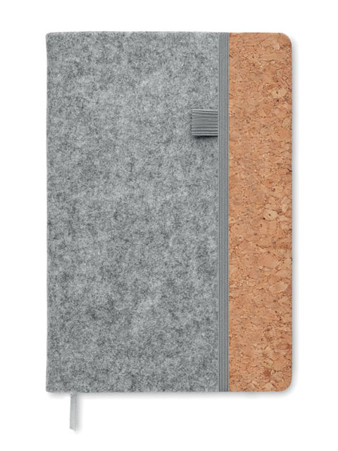 A5 jegyzetfüzet RPET filc és parafa borítóval. 160 vonalas oldal (80 lap) újrahasznosított papírból. Az első borítón elasztikus tolltartó hurokkal és elasztikus zárópánttal. Könyvjelző szalaggal. FSC MIX 100% | P7.1 | FSC-C213206
