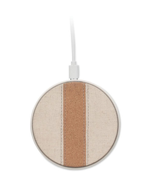 Vezeték nélküli töltő újrahasznosított ABS-ből, pamut és parafa részletekkel. Csatlakoztassa a számítógéphez és helyezze rá az okostelefont. Kimenet: DC 9V/1.67A (15W).