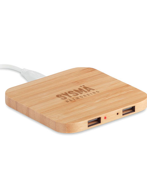 Vezeték nélküli töltő lap bambusz bevonattal, 2.0 USB hub-bal. Teljesítmény DC5V/1A (5W). A bambusz természetes anyag, színében, mintázatában és méretében esetenként eltérő lehet.