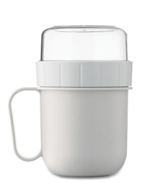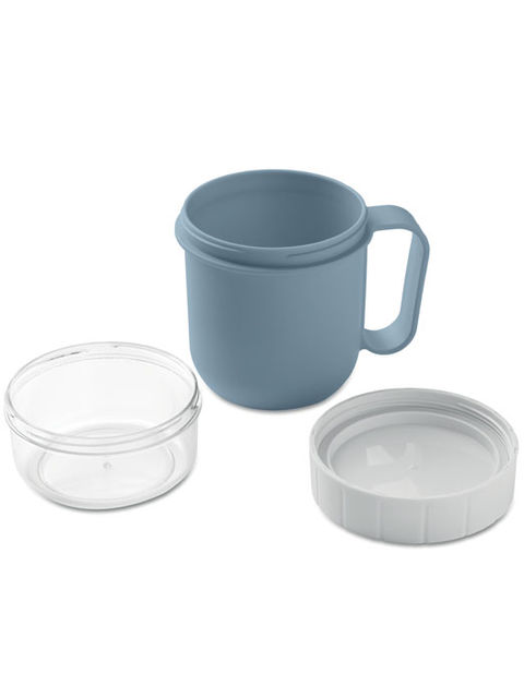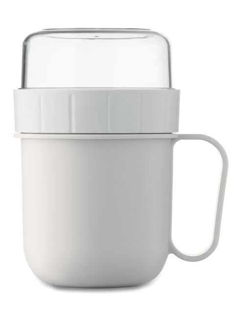 Reggeliző- vagy úti bögre PP-ből, PS tartállyal. A két külön rekeszben elkülöníthetők a hozzávalók. Szivárgásmentes. Űrtartalom: 450 ml és 160 ml.