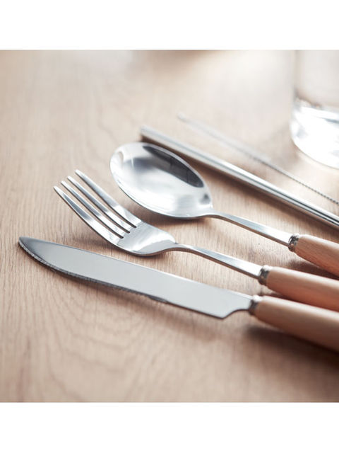 Többször felhasználható, rozsdamentes acélból készült, bükkfa nyelű evőeszközből álló készlet vászon tokban. Kést, villát, kanalat, rozsdamentes acél szívószálat és tisztítókefét tartalmaz.