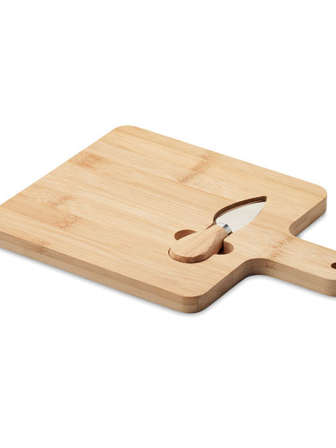 Bambusz sajttálaló készlet kínálódeszkával és sajtkéssel. A bambusz természetes anyag, színében, mintázatában és méretében esetenként eltérő lehet.