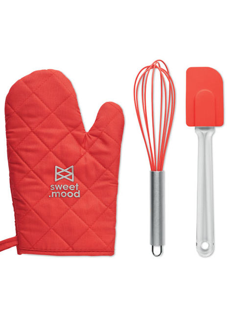 Sütő kellék készlet. Tartalmaz egy 95% poliészter és 5% pamut kevert szálas anyagból készült konyhai edényfogó kesztyűt, kézi habverőt, valamint szilikon spatulát.