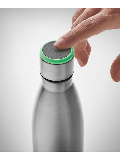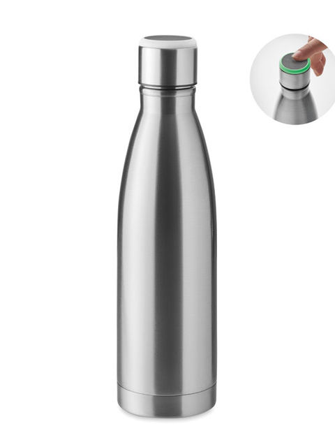 Duplafalú rozsdamentes acél palack hidratációs emlékeztetővel. A kupakba épített fény óránként világít, emlékeztetve a folyadékbevitelre. A működéshez szükséges 1 db CR2032 elemmel szállítjuk. Űrtartalom: 500 ml.