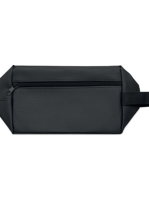 600D RPET poliészterből készült piperetáska PU bevonattal és 210D RPET béléssel. Fogantyúval, cipzáras elülső zsebbel.