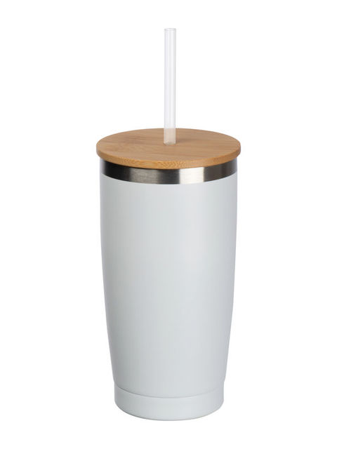 Rozsdamentes acél termoszbögre vákuumszigeteléssel, bambuszfedéllel valamit stabil műanyag szívószállal.