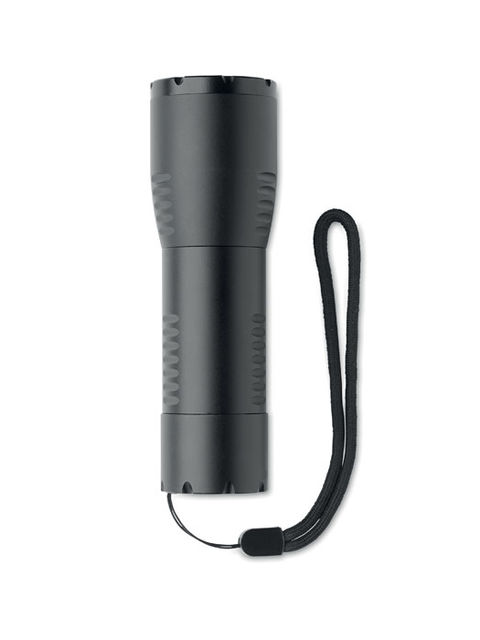 Alumíniumból készült, kis LED-es zseblámpa állítható fókusszal, levehető pánttal. Teljesítmény: 200 lumen. 3 db AA elemmel működik, elem nélkül szállítjuk.