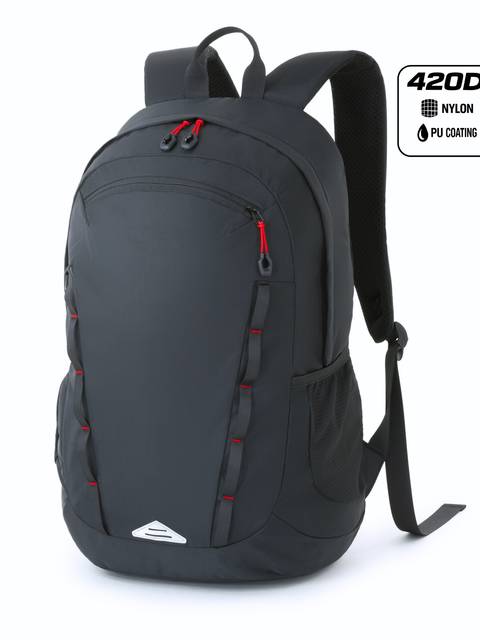 Tartós, közepes méretű sport hátizsák 420D nejlonból, PU bevonattal. Egy fő rekesszel, elülső cipzáras zsebbel, rugalmas hálós oldalzsebekkel és párnázott hálós hátrésszel rendelkezik a kényelem érdekében. Tartalmaz egy pántot a bőrönd fogantyújához való rögzítéshez.