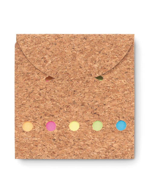 Öntapadós jegyzetelő szett boríték jellegű parafa borítóval. 125 lapos nagyméretű sárga öntapadós jegyzettömb és 25 lapos, 5 különböző színű lapjelző. A parafa 100%-ban természetes anyag. Szerkezeti jellege és felületi porozitása miatt az egyes tárgyak végső emblémázási eredménye eltéréseket mutathat.