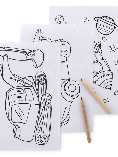 Gyerek színezőkészlet 30, újrahasznosított papírból készült kiszínező lappal. 6 színesceruzát, valamint hegyezőt és radírt tartalmaz.