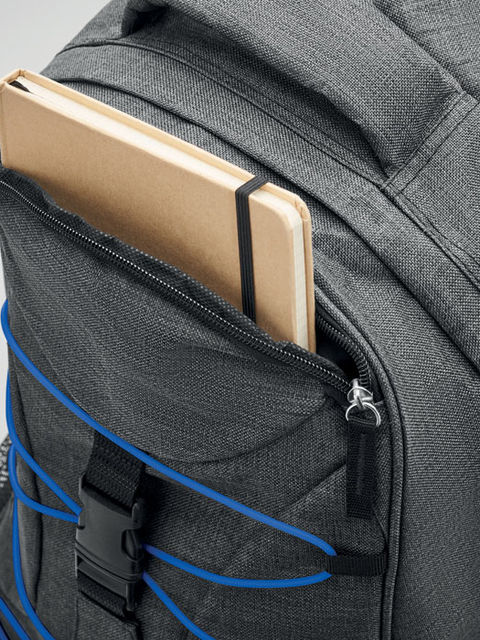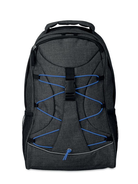 600D melírozott poliészter hátizsák színes kontrasztos elemekkel, az elején sötétben világító zsinórral. Mindkét oldalán hálós zsebekkel.