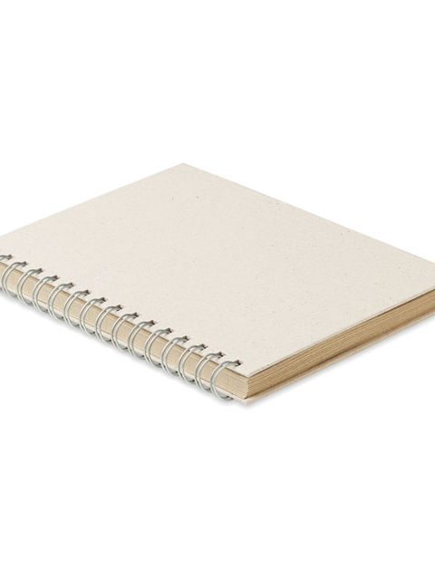 A5-ös spirálos jegyzetfüzet 80 vonalas fűpapír lappal és karton borítóval. Kényelmes és praktikus az irodai megbeszélések vagy iskolai jegyzetek leírásához. A fűpapír tökéletes tudatos promóciós reklámajándék. Az előállítási folyamat az elejétől a végéig fenntartható és környezetbarátabb, mint a hagyományos faalapú papíré. EU-ban gyártva.