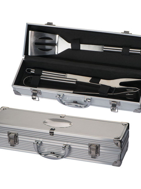 Zárható fém grillező szett, zárpánttal és hordozó füllel. Húslapát, grillvilla és grillcsipesz tartozik a szetthez.