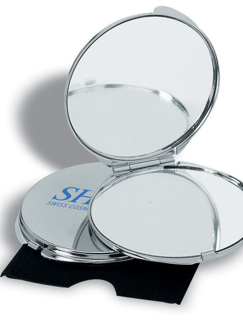 Krómozott fém sminktükör, sima és nagyítós oldallal. Bársonytokban.