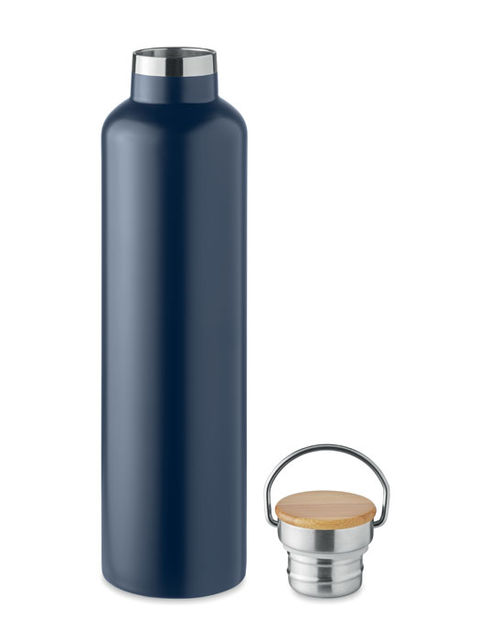 Duplafalú rozsdamentes acél termosz fém fogantyús bambusz kupakkal. Űrtartalom: 1 l. A bambusz természetes anyag, színében, mintázatában és méretében esetenként eltérő lehet.