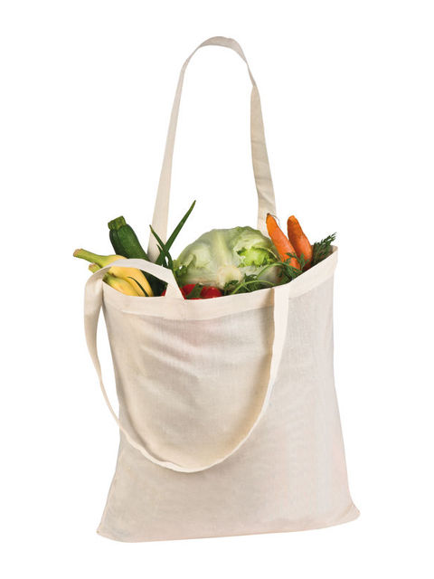 Natúr színű Oeko-Tex pamut táska hosszú füllel. A bevásárlótáska használata környezetbarát, 100% pamutból készül.