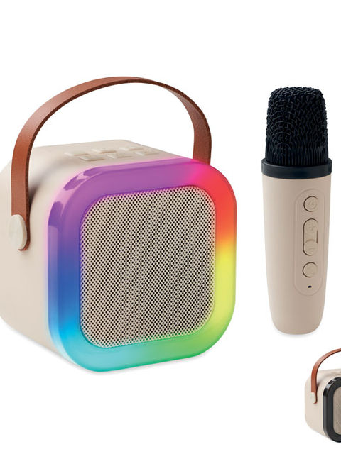 Karaoke szett 5W-os vezeték nélküli hangszóróval, LED sz ínváltó világítással, újrahasznosított ABS-ből, PU fogantyúval, valamint mikrofonnal. A hangszóró beépített 800 mAh akkumulátorral, a mikrofon 400 mAh akkumulátorral rendelkezik. Üzemidő: 3 óra.