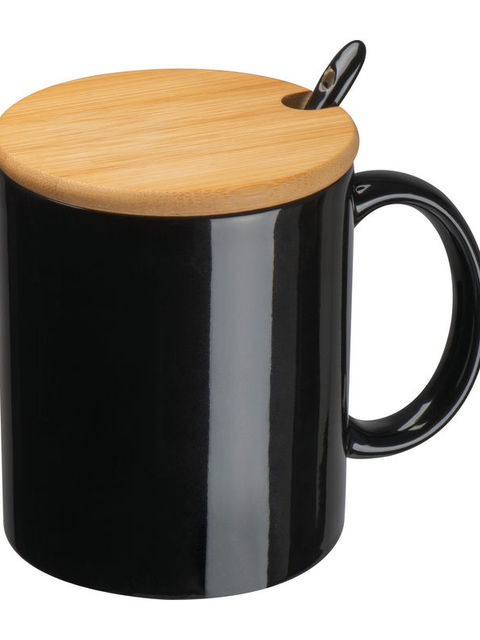 Kerámia bögre bambusz tetővel, hozzáillő kivágással a kanálnak és 300 ml űrtartalommal.