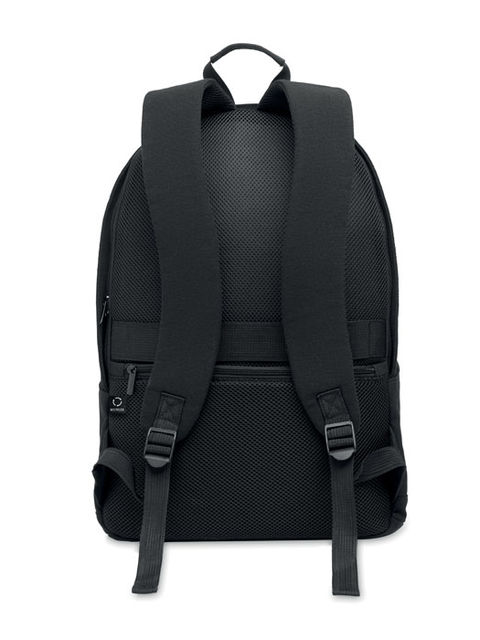 15 colos laptop hátizsák 70% fogyasztás előtti újrahasznosított pamutból és 30% újrahasznosított poliészterből. Elöl cipzáras zsebbel. Puha párnázott hát és vállpántok. Hátoldalán gurulós bőröndre illeszkedő pánttal.