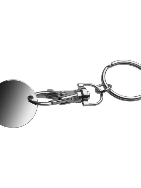 Kulcstartó egy karabinerről levehető bevásárlókocsi érmével. Az érme egyik oldala tökéletes hely a logó számára.