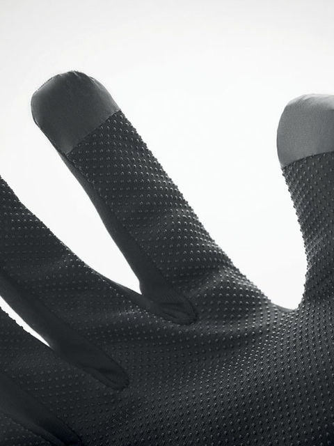 Kapacitív sportkesztyű okostelefonhoz, poliészterből. Két ujj érintésérzékeny funkcióval, a tenyér és az ujjak PVC csúszásgátló részletekkel rendelkeznek.