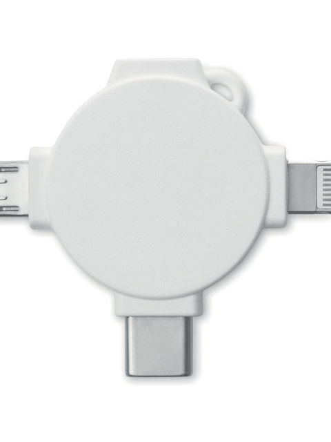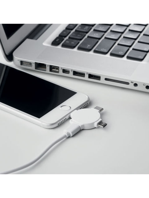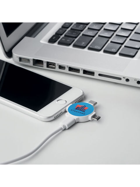 3 az 1-ben töltőkábel 3 különböző (mikro USB, C típusú és Lightning) csatlakozóval. Kompatibilis iOS and Android eszközökkel is. Ideális 4 szín kolor emblémázáshoz.