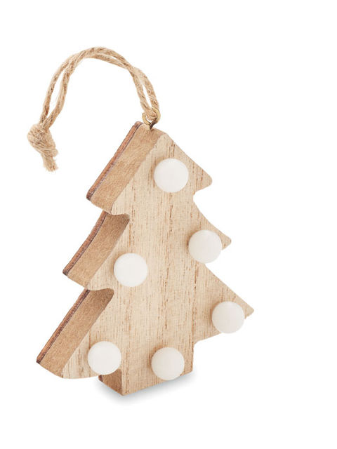 Fából készült fenyő alakú karácsonyfadísz 6 LED-es fénnyel, akasztózsinórral. A működéshez szükséges 1 db CR2032 elemmel szállítjuk. A fa természetes anyag, termékenként szín- és méretbeli eltérések jelentkezhetnek, ami befolyásolhatja a dekoráció végső eredményét.