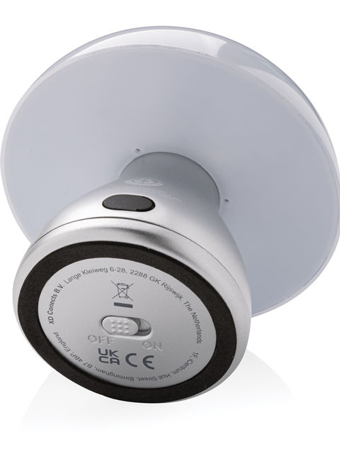 Divatos, újratölthető és hordozható asztali lámpa, amely jól mutat az asztalon vagy a nappaliban egyaránt. RCS újrahasznosított ABS-ből és RCS újrahasznosított alumíniumból készült. Teljes újrahasznosított anyag tartalom: 84% a termék összsúlya alapján. Az RCS-tanúsítvány biztosítja az újrahasznosított anyagok ellátási láncát. Az asztali lámpa egyetlen töltéssel 18 órán keresztül működik és 2 óra alatt újratölthető. Két üzemmóddal (meleg fény és fehér fény) melyek érintéssel változtathatók. USB-C töltővel újratölthető. FSC® mix csomagolásban. IPX 4 vízállóságú.
