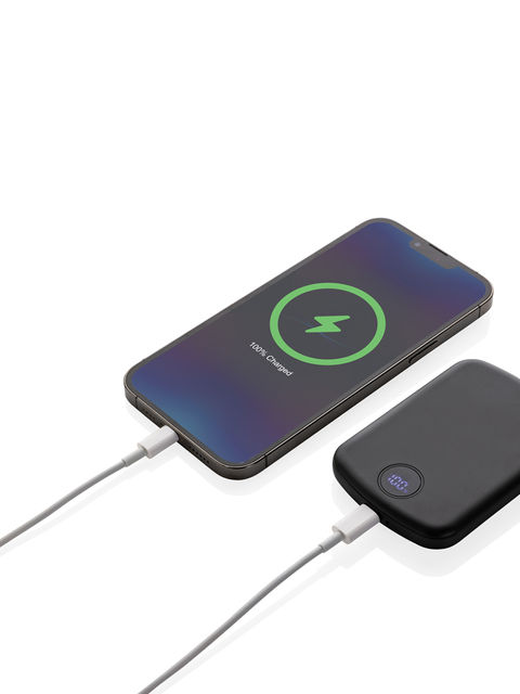 5000 mAh, zsebméretű powerbank 15W-os mágneses, vezeték nélküli töltővel, melynek háza RCS újrahasznosított ABS műanyagból készült. Az RCS-tanúsítvány biztosítja az újrahasznosított anyagok ellátási láncát. Teljes újrahasznosított anyagtartalom: 21% a termék összsúlya alapján. A powerbank hosszú élettartamú, A-fokozatú, 5000mAh lítium-polimer akkumulátort tartalmaz. Beépített digitális LED töltöttségjelző; C típusú bemenet 5V/2,4A; C típusú kimenet: 5V/2A. 4A A termék és tartozékai PVC-mentesek. RCS újrahasznosított TPE töltőkábellel. FSC® mix csomagolásban. C típusú bemenet: 5V/3A 9V/2A 12V/1,5A; kimenet: USB-C kimenet: 5V/2,4A, 9 V/2,22A, 12V/1,67A; vezeték nélküli kimenet: 15W