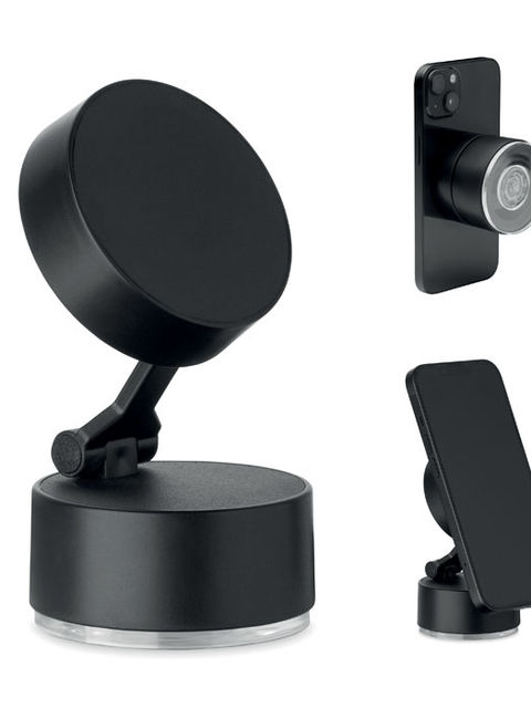 Mágneses telefontartó ABS-ből. Vákuumos rögzítés. Kompatibilis az iPhone® 12 és újabb készülékekkel. További mágneses fémgyűrűvel, amely támogatja más, nem mágneses vezeték nélküli tölthető telefonok töltését.