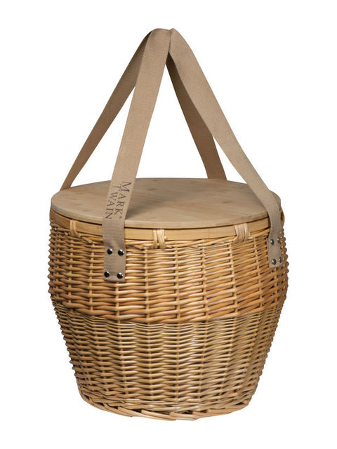 Mark Twain rattan piknik kosár hűtőrekesszel. A bambusz fedő vágódeszkaként vagy tálalódeszkaként is használható, míg maga a kosár piknikasztalként is funkcionál.