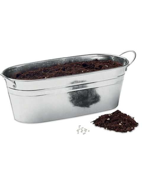 Cink ültetőedény 3 féle - bazsalikom, kakukkfű és petrezselyem- fűszernövénymagot tartalmazó válogatással, kerti komposzttal. EU-ban gyártva.